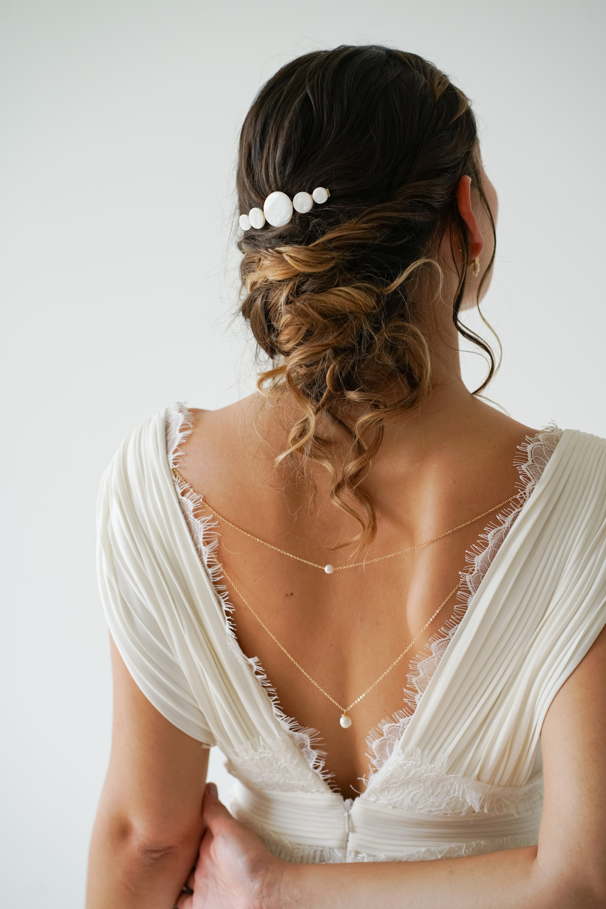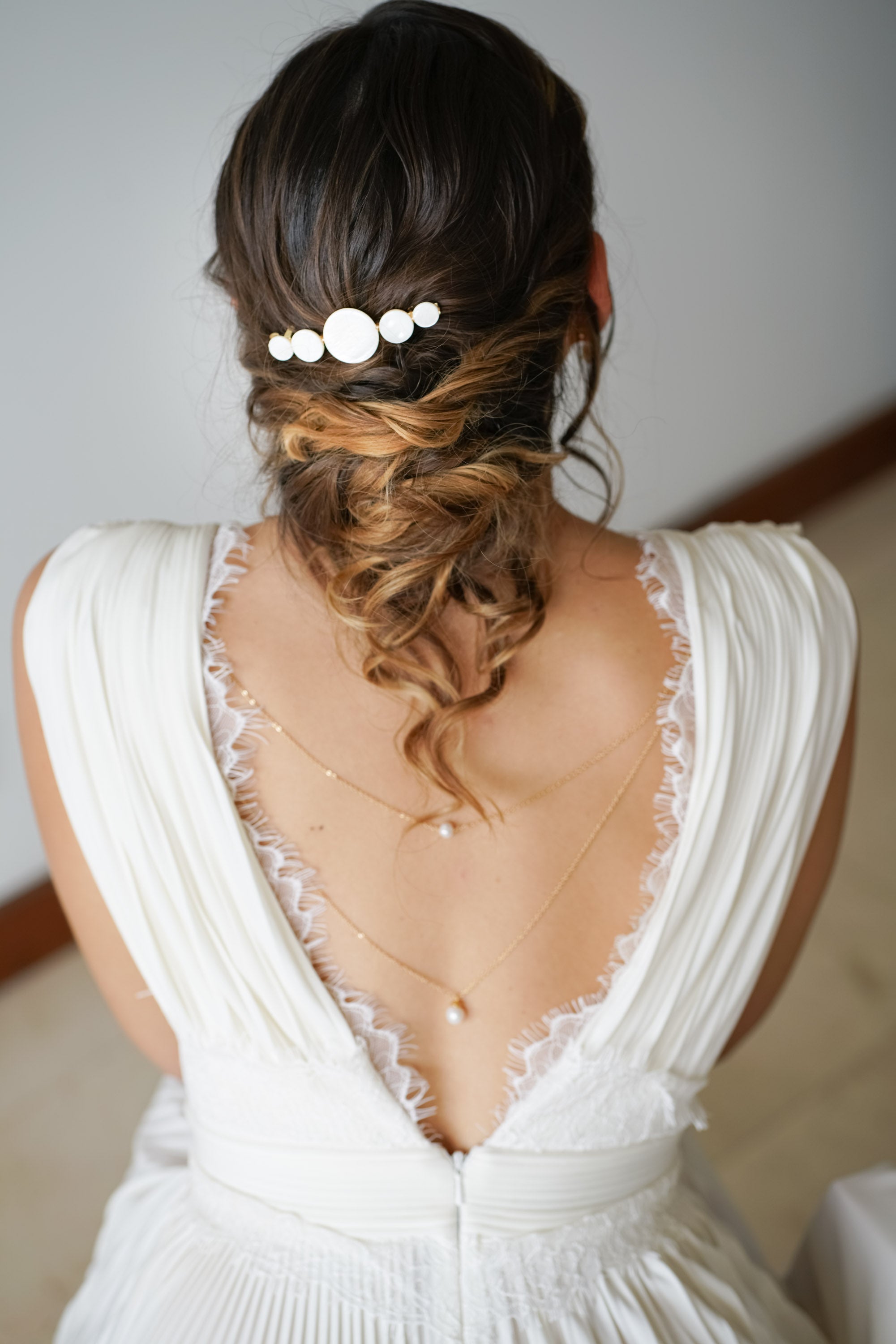 mariée en tenue pour son mariage avec une coiffure en chignon accompagné d'un peigne en nacre