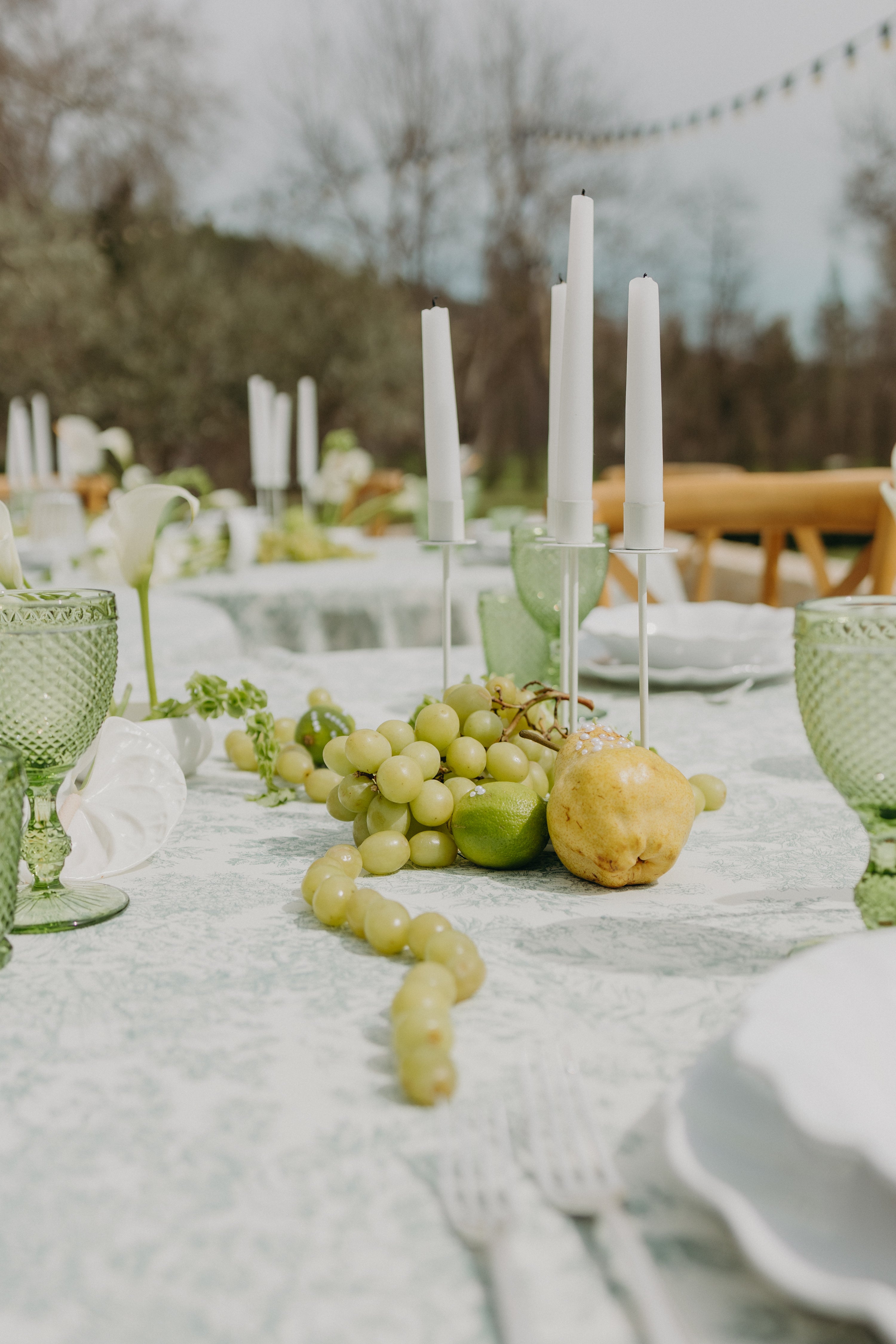 O tema de casamento com azeitonas e matcha se traduz em uma rica paleta de cores verdes. Arranjos de mesa originais podem ser criados com frutas e vegetais como peras, figos e limões, reforçando a sensação natural e autêntica da celebração. Folhas de oliveira, eucalipto e galhos delicados complementam os arranjos florais, adicionando profundidade e movimento a cada mesa.