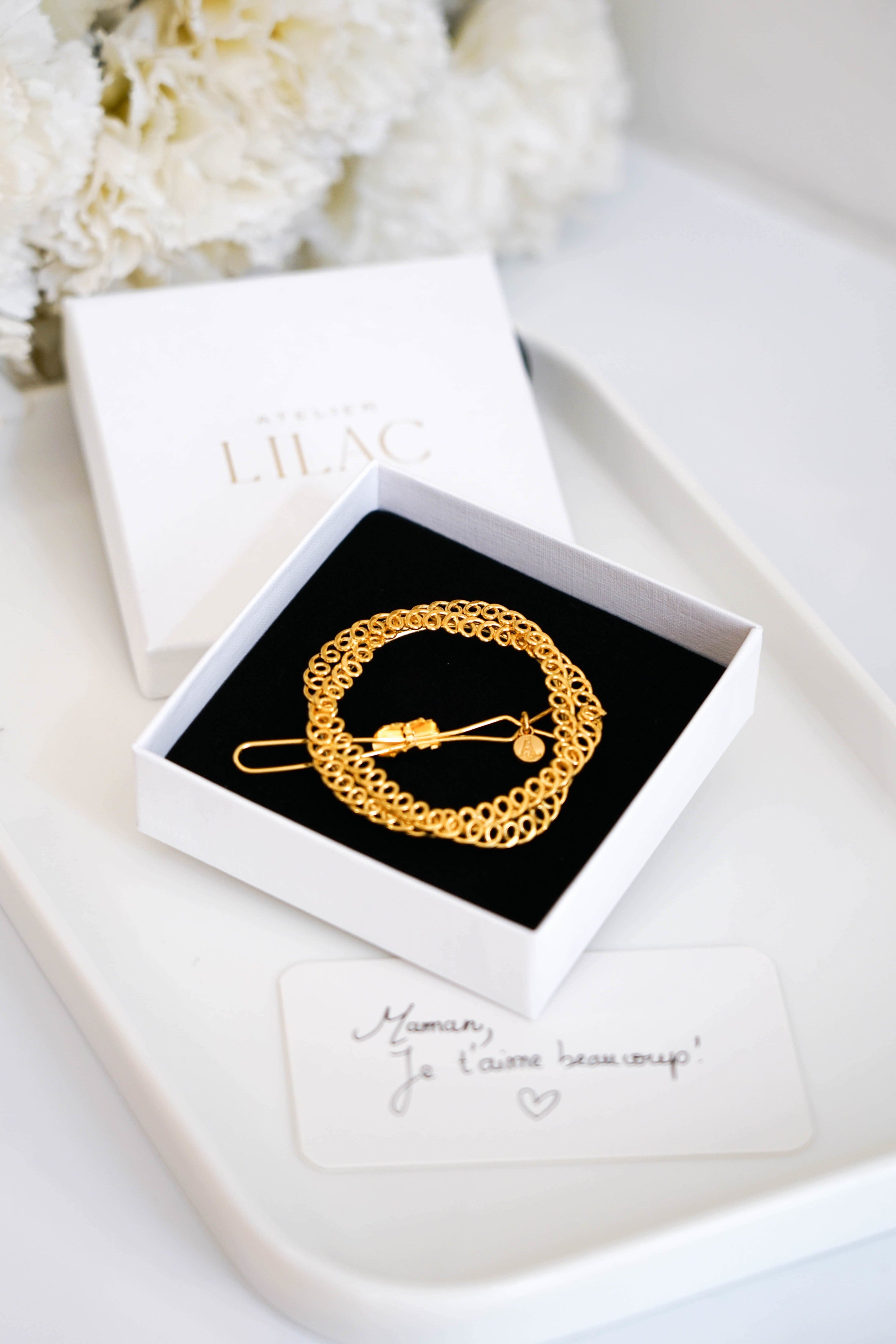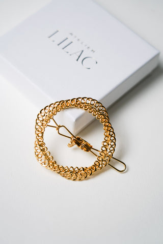 Nossa presilha Ensemble é um acessório de cabelo moderno e minimalista. Esta criação foi feita em nossa oficina. Sua estrutura circular é feita de fios de bronze enrolados. A peça final é banhada em ouro 24k para a versão dourada ou em prata 925 para a versão prateada. Esta joia para a cabeça será o complemento perfeito para o seu look. Gracioso em cabelos curtos e longos!