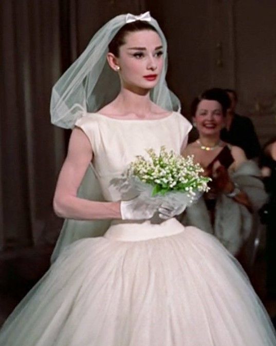 O conjunto da noiva é complementado por acessórios de cabelo cuidadosamente escolhidos, que dão um toque sutil, mas significativo ao seu look. Um véu delicado , embelezado com uma gravata borboleta combinando, envolve delicadamente o cabelo de Audrey Hepburn, adicionando um toque de graça e sofisticação ao seu traje.