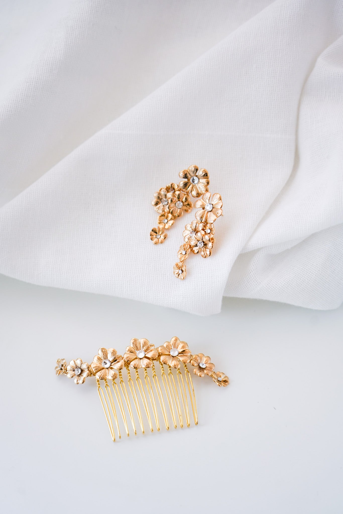 Esta delicada joia foi feita com lindas flores metálicas banhadas a ouro 24k. No meio de cada linda flor foi incrustado um mini cristal transparente. Este enfeite de flor foi montado em uma palheta dourada de tamanho médio. Este acessório é maleável, o que lhe permitirá adaptá-lo ao seu penteado de noiva como desejar.