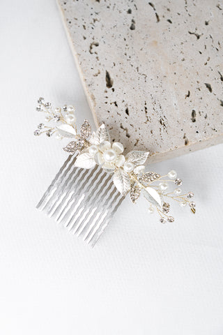 peigne mariage en perles naturelles et argent avec des fleurs et des cristaux passé sur une plaque de marbre