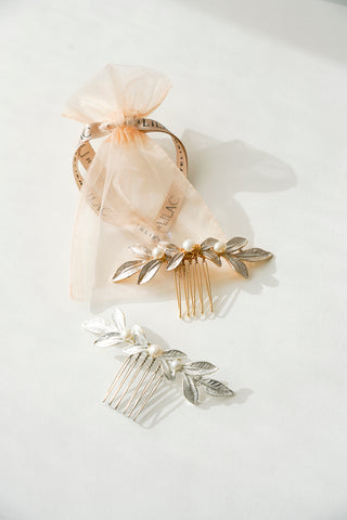Esta criação é feita com galhos de folhas douradas ou prateadas. No meio do pente, pérolas naturais enfeitam este acessório. Este complemento de penteado pode ser usado em um coque ou no cabelo solto.