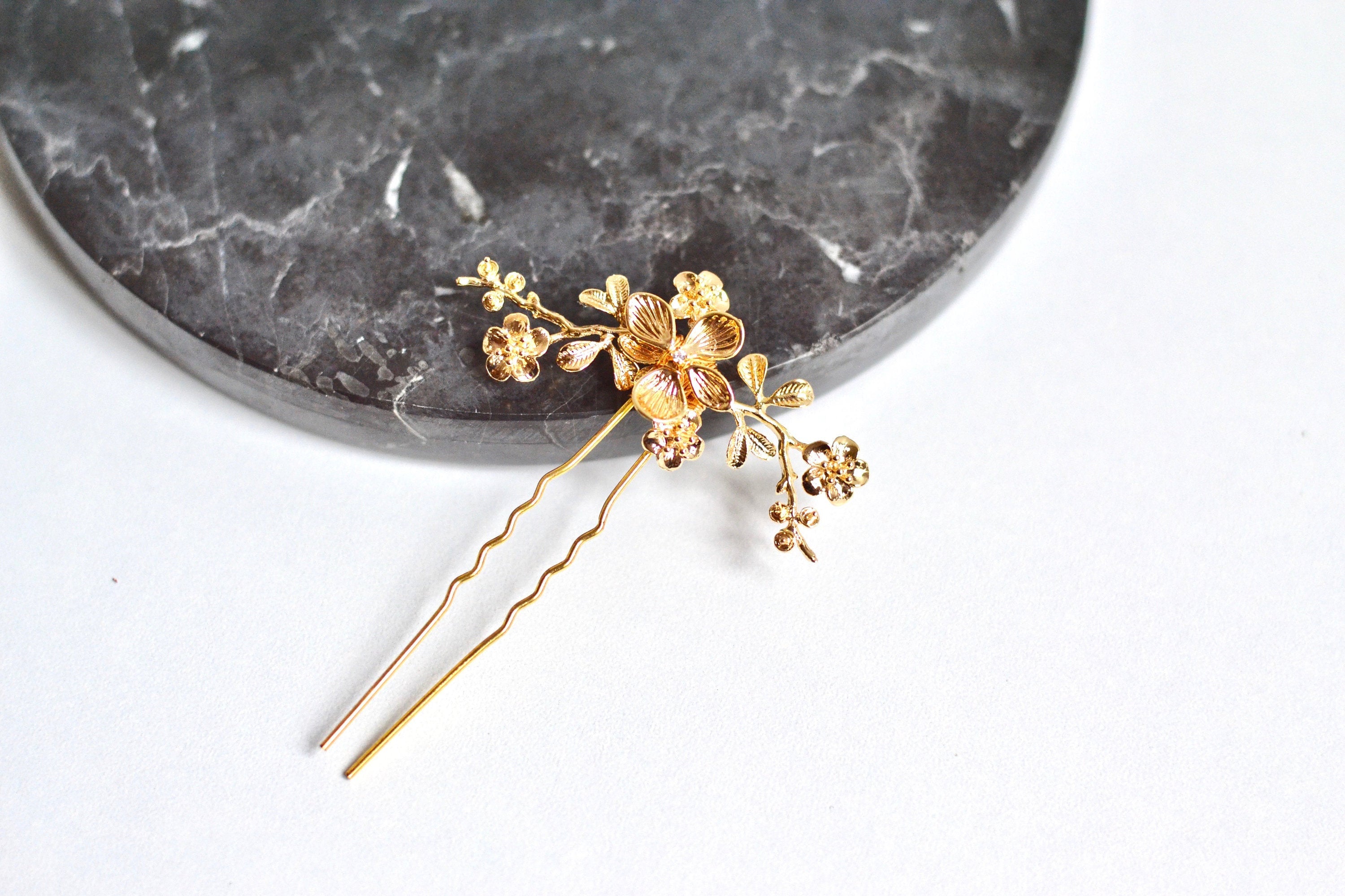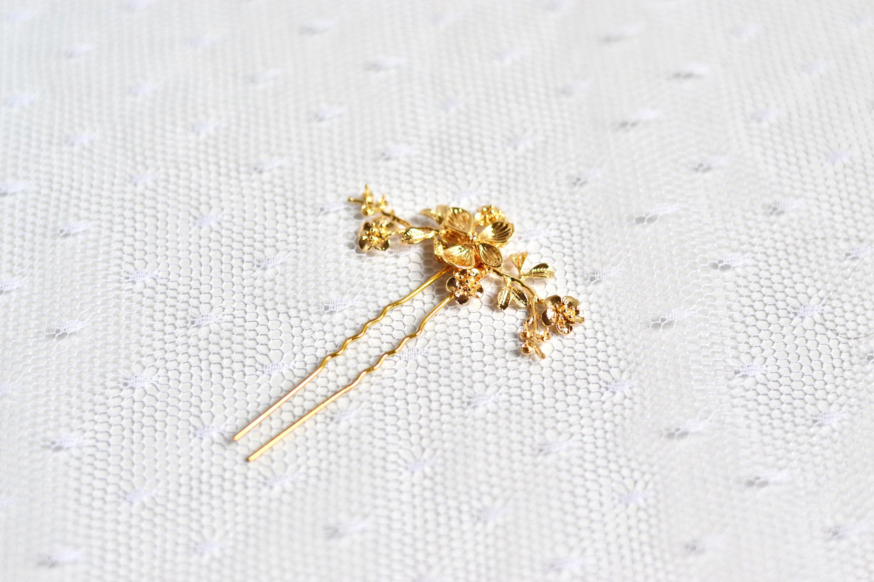 Este acessório de cabelo foi projetado e criado com arame de metal para combinar delicados galhos de folhas e uma linda flor com uma pequena zircônia no meio. Todas as peças centrais deste acessório floral foram banhadas a ouro 24k.