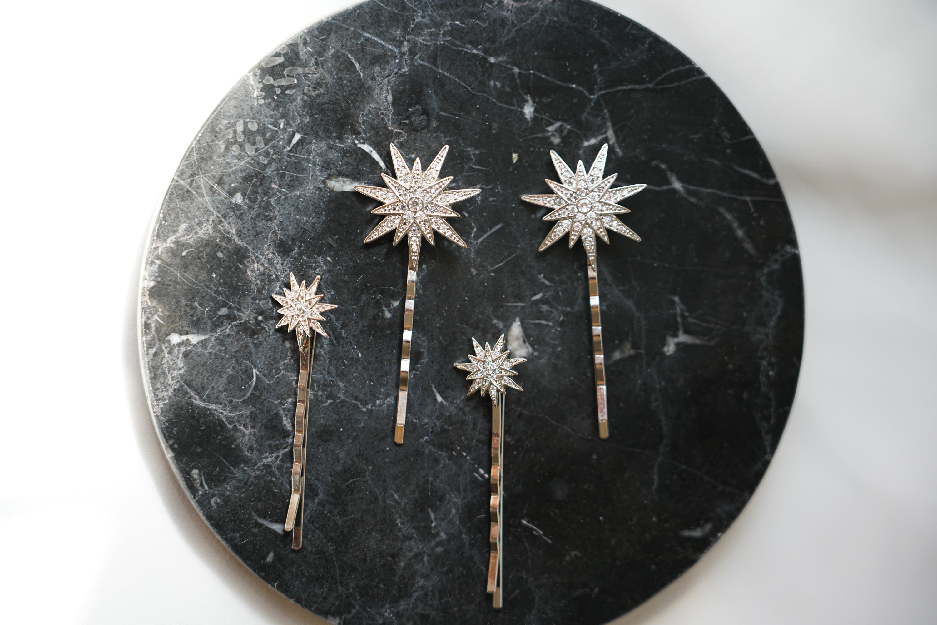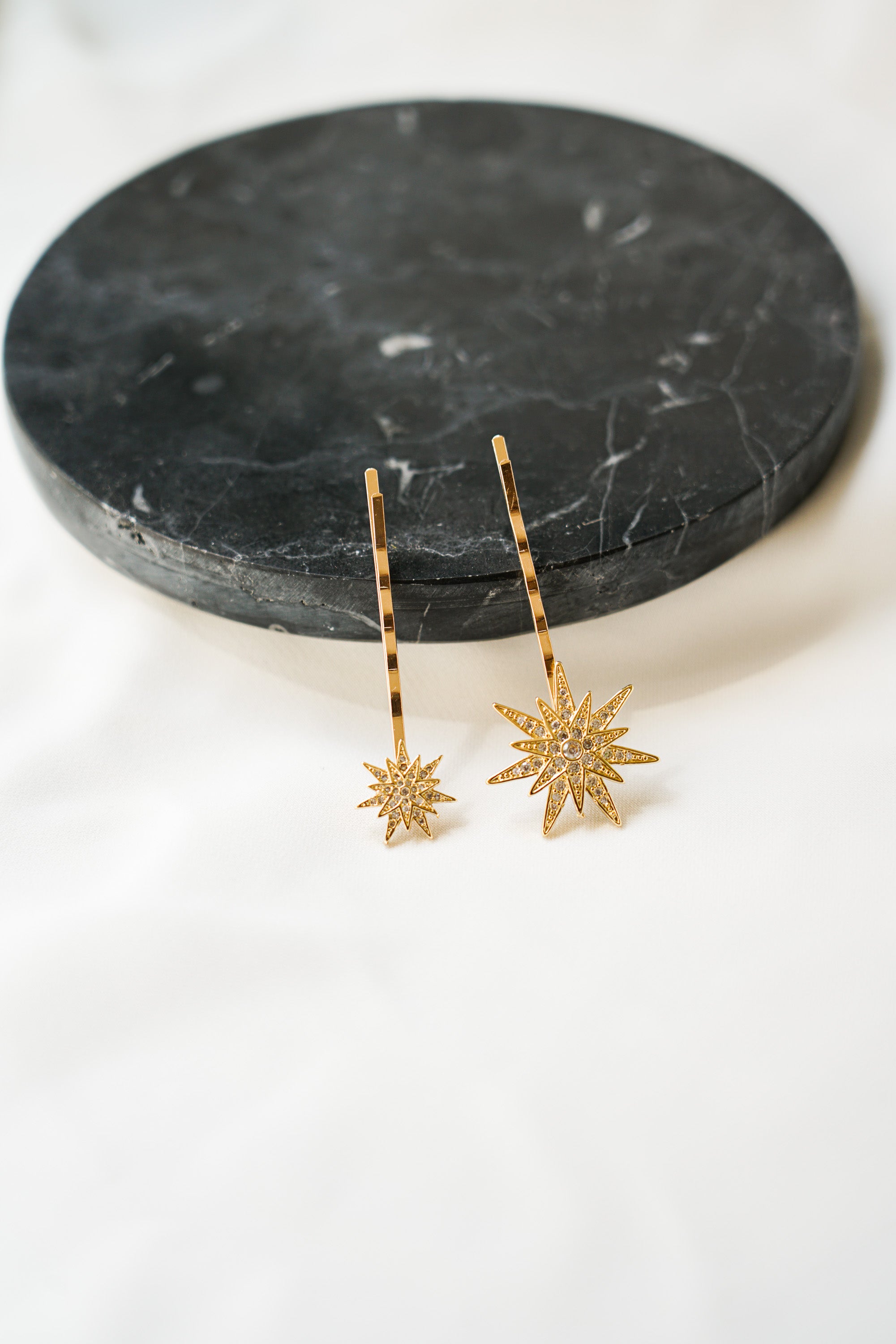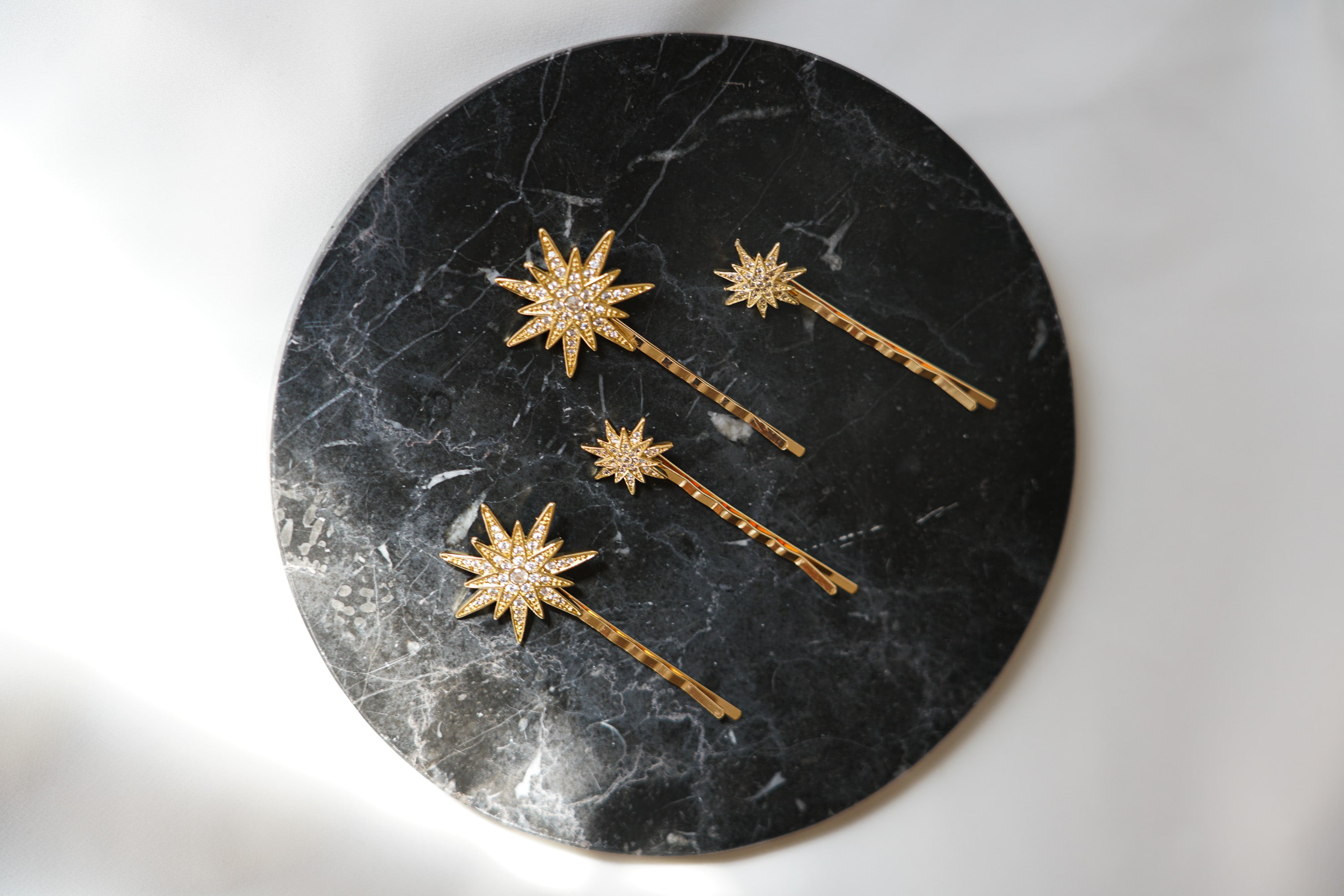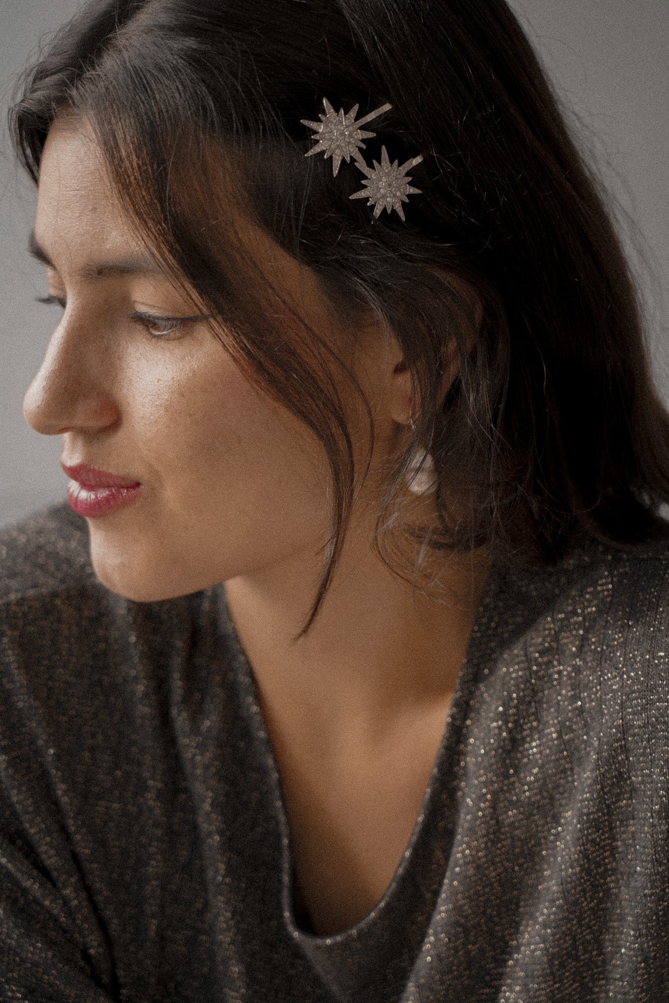 Estes acessórios foram confeccionados com estrelas grandes e pequenas em metal dourado envelhecido, todas as estrelas possuem incrustações de cristais transparentes muito finos e discretos. Cada estrela foi então associada a uma base de metal dourado envelhecido.