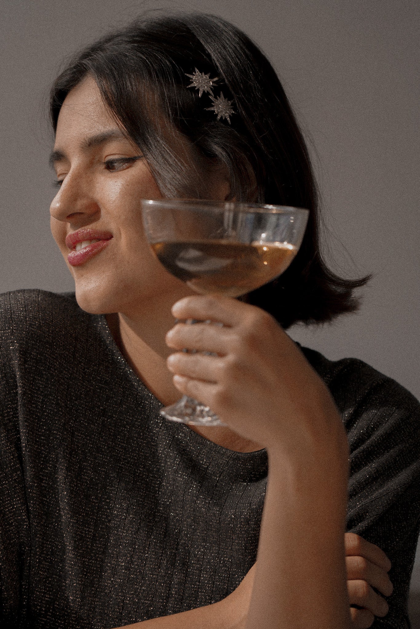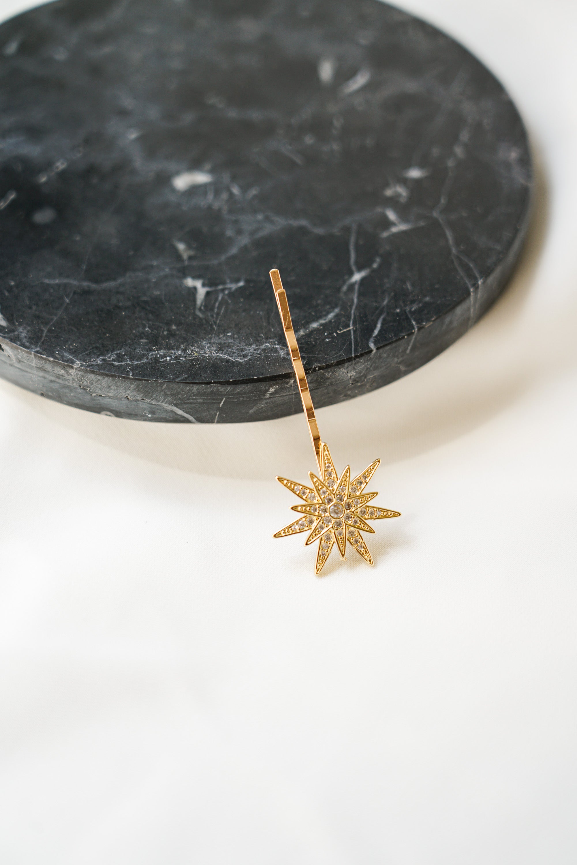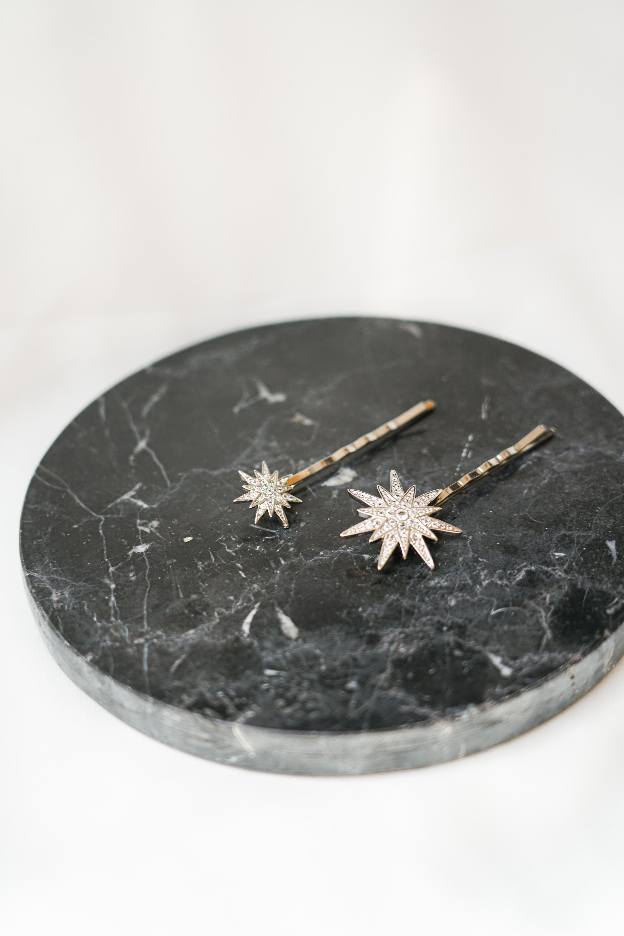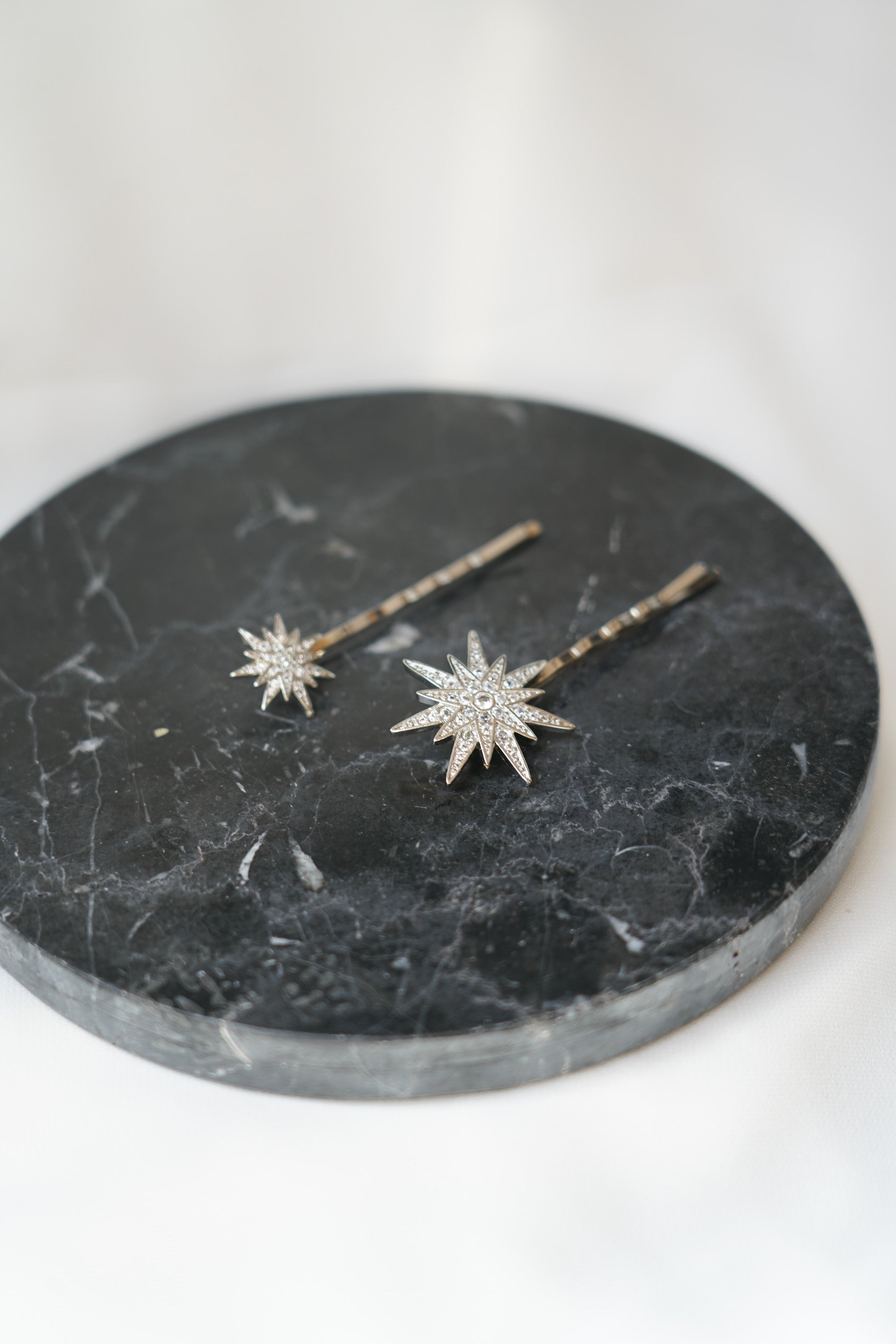 Estes acessórios foram confeccionados com estrelas grandes e pequenas em metal dourado envelhecido, todas as estrelas possuem incrustações de cristais transparentes muito finos e discretos. Cada estrela foi então associada a uma base de metal dourado envelhecido.
