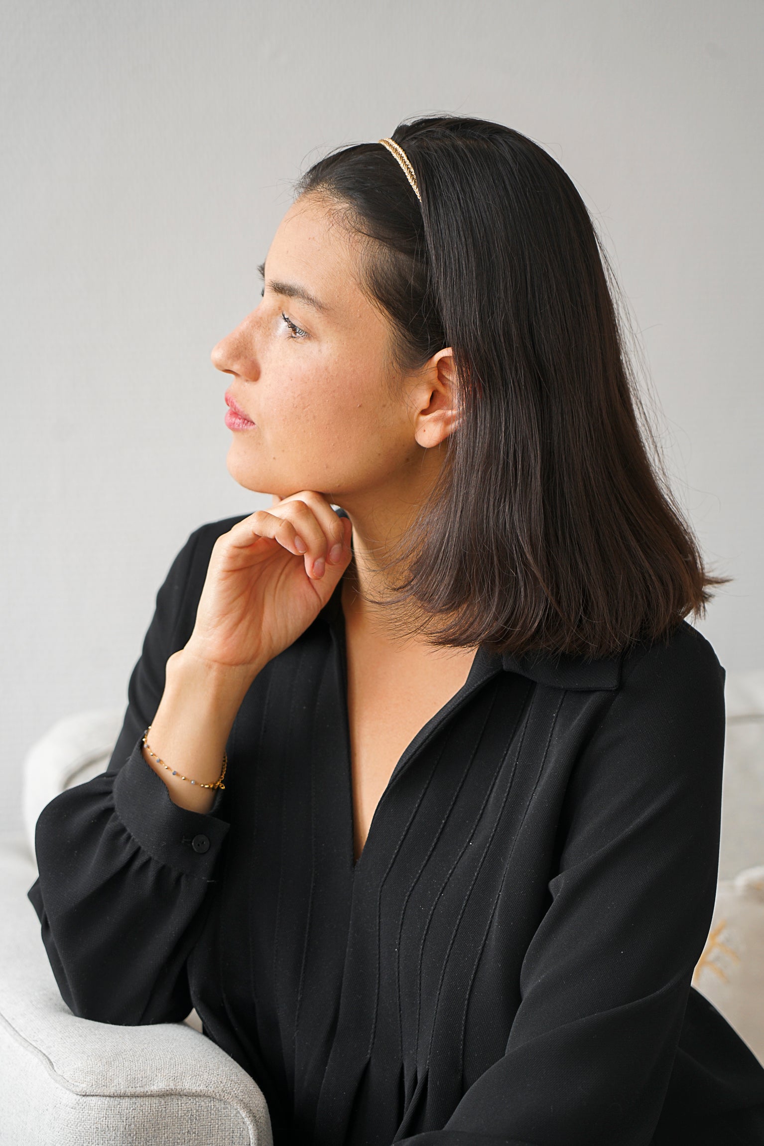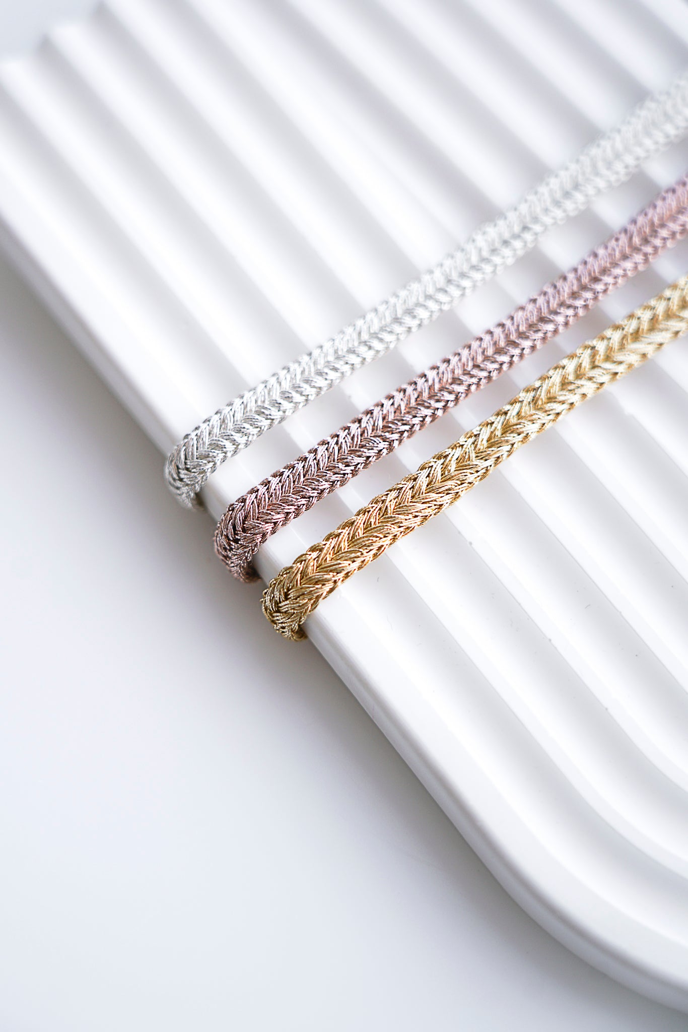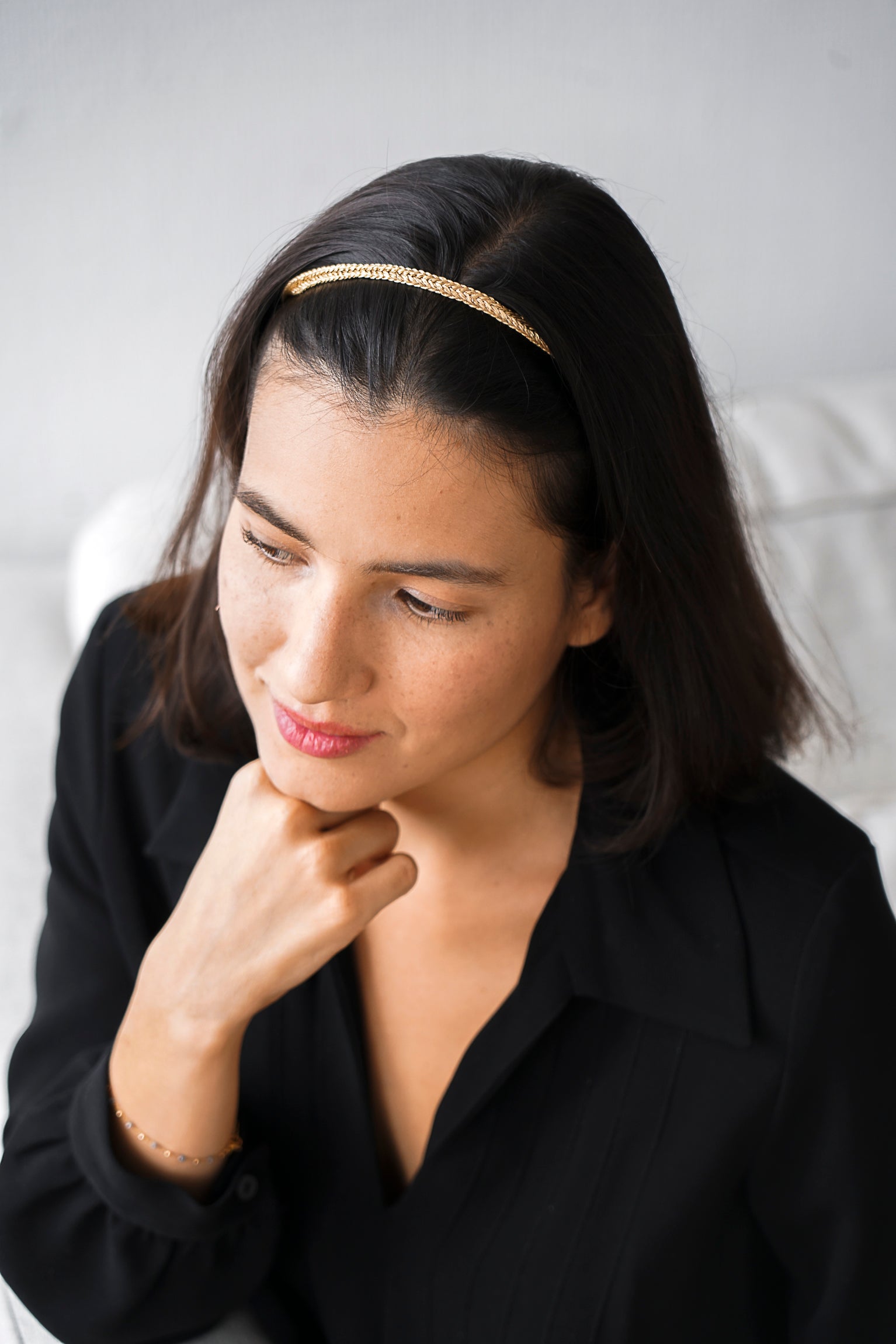 Este lindo acessório de cabelo é feito de fios metálicos cuidadosamente trançados. O padrão de trança é muito único, lembrando uma trança estilo “peixe”. Na parte de trás, esta joia é cuidadosamente costurada a um elástico preto, garantindo assim um ajuste perfeito a todos os tamanhos de cabeça.