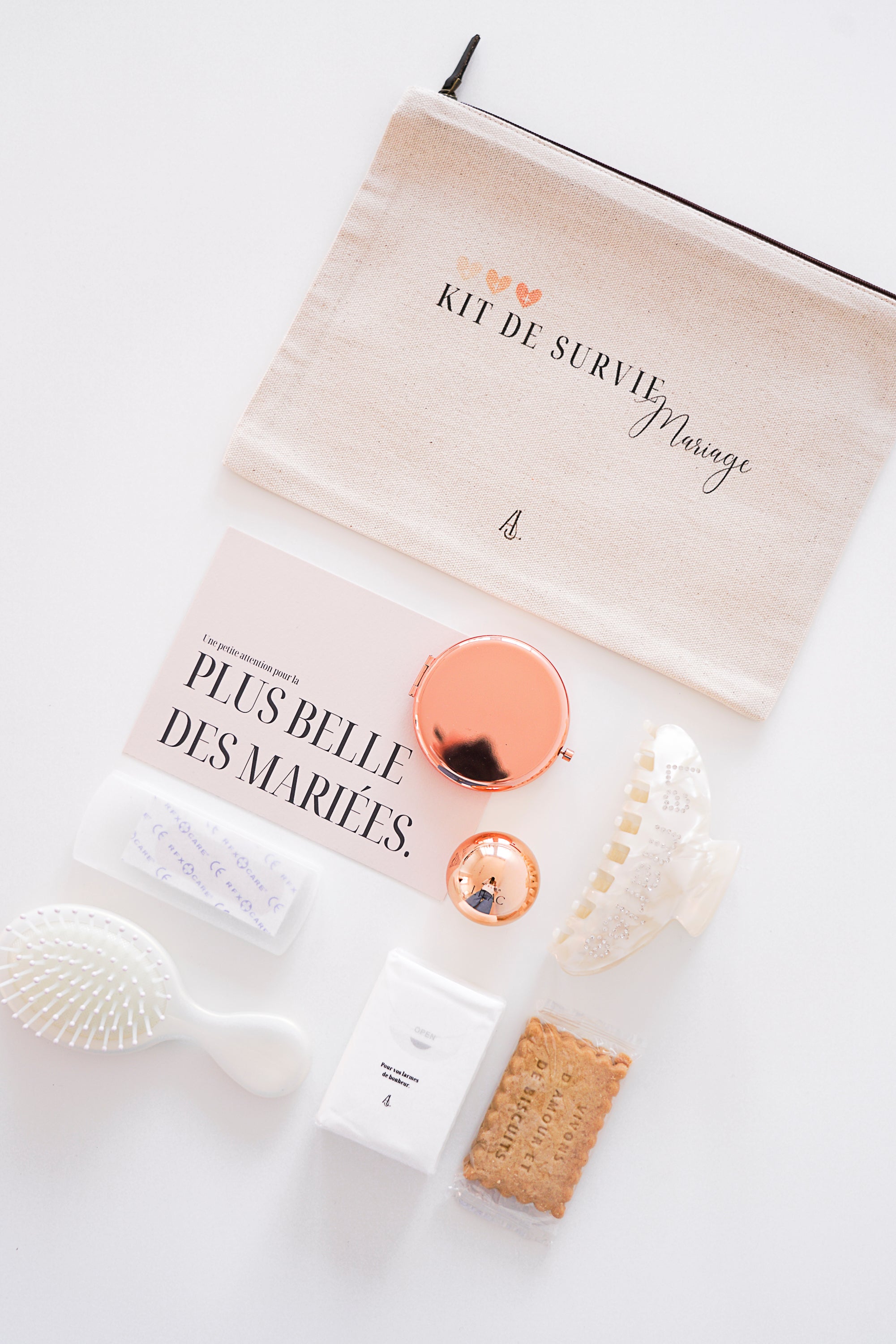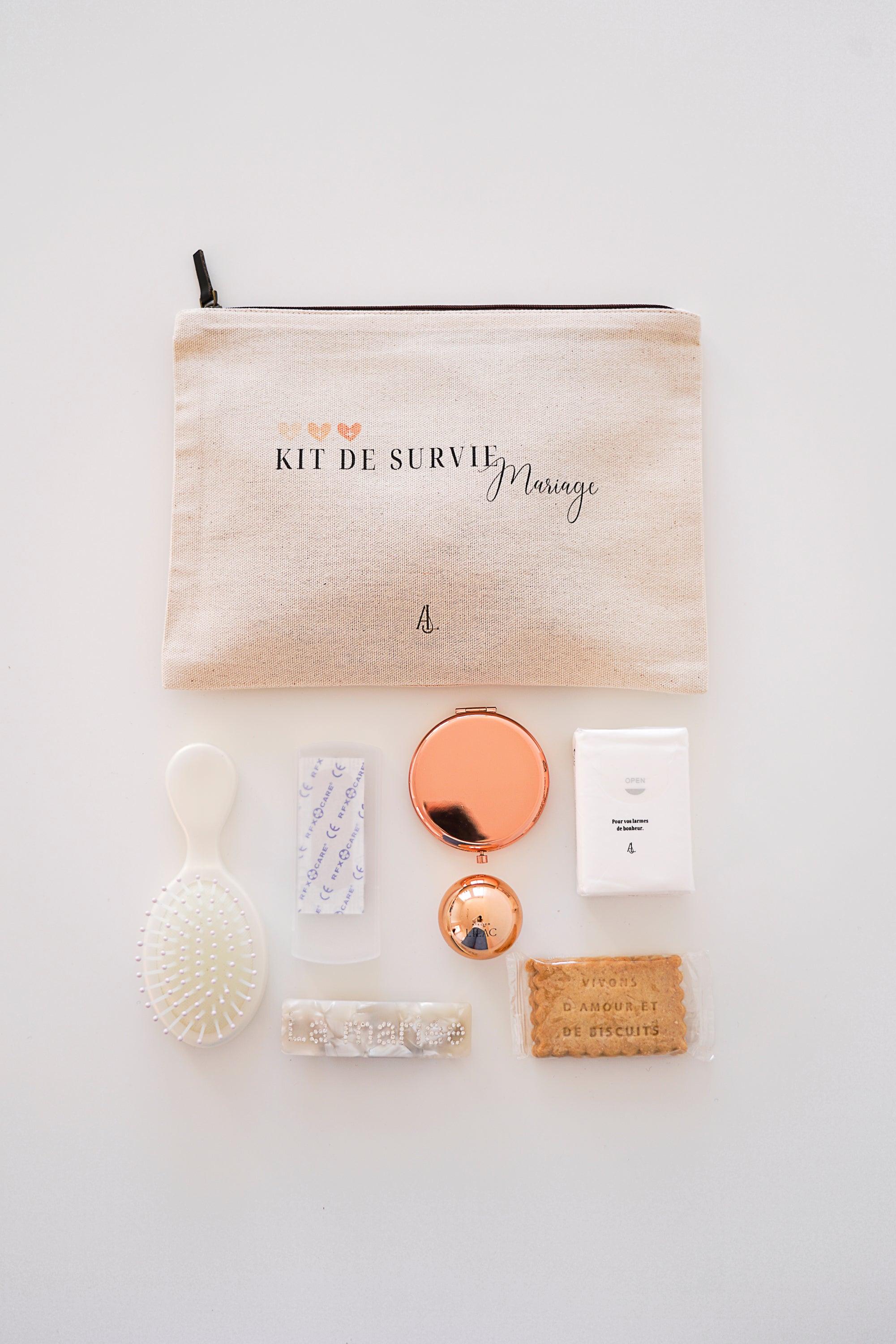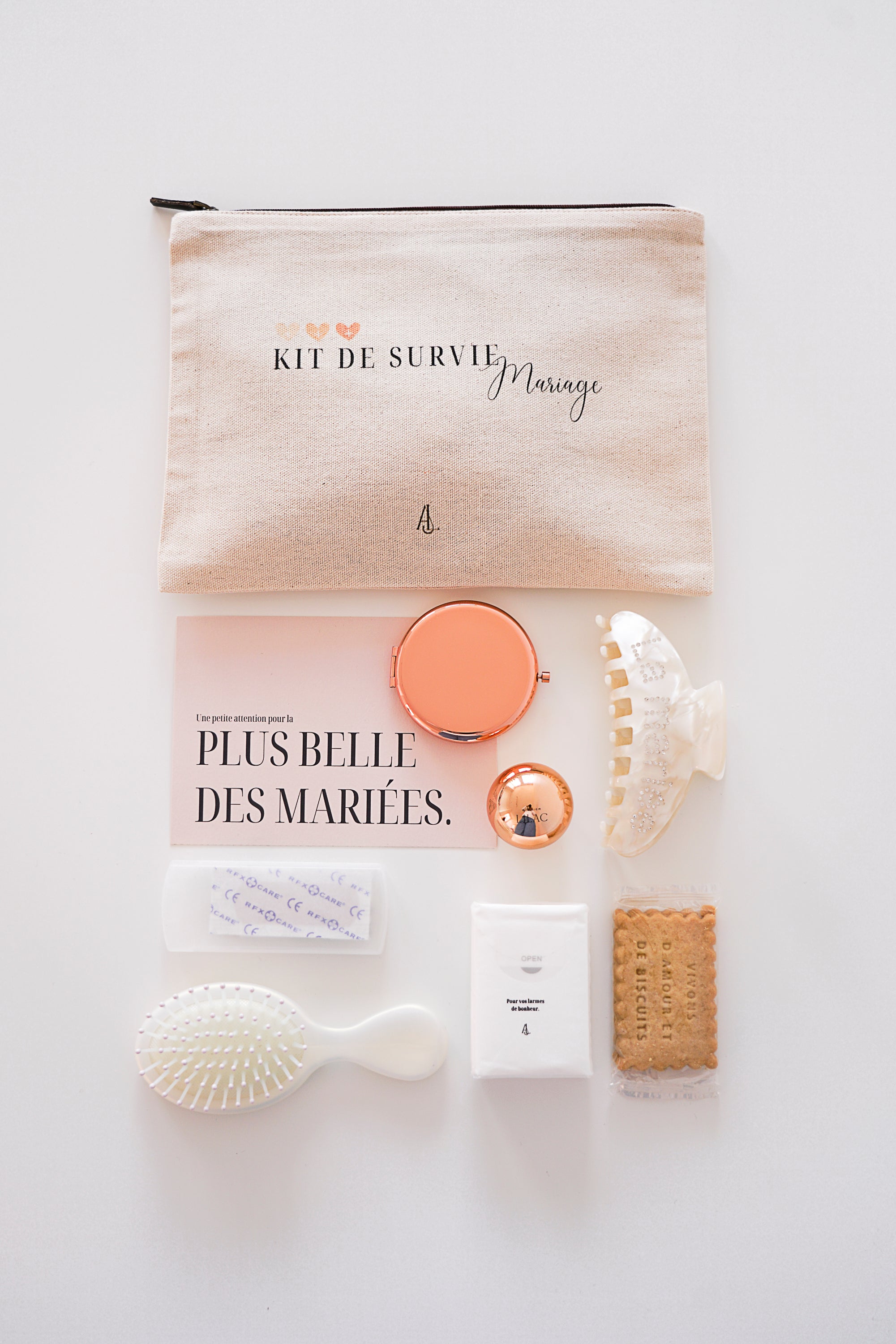 Kit de survie cadeau pour future mariée avec miroir de poche, baume à lèvre, biscuits, barrette la mariée, brosse à cheveux, mouchoirs