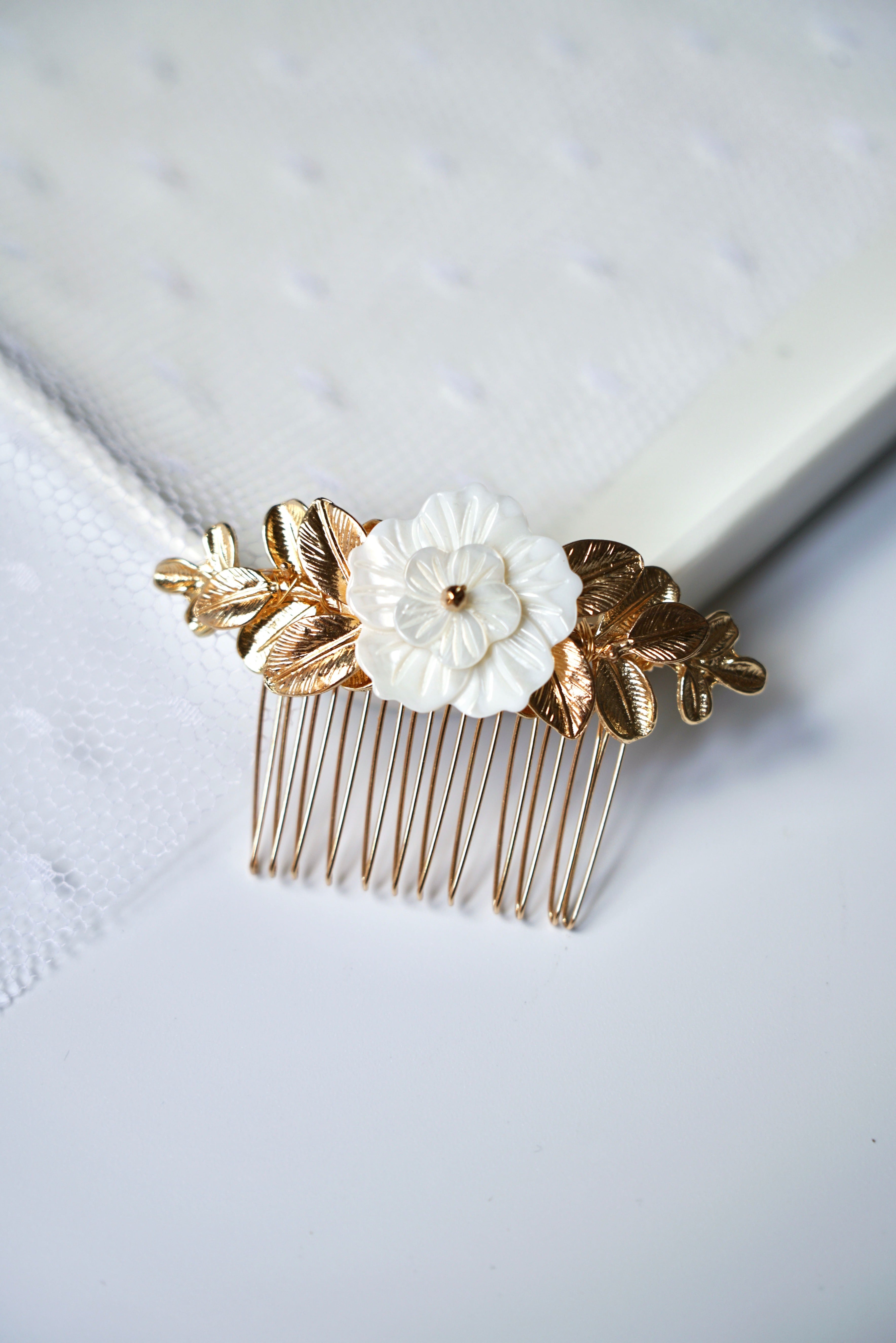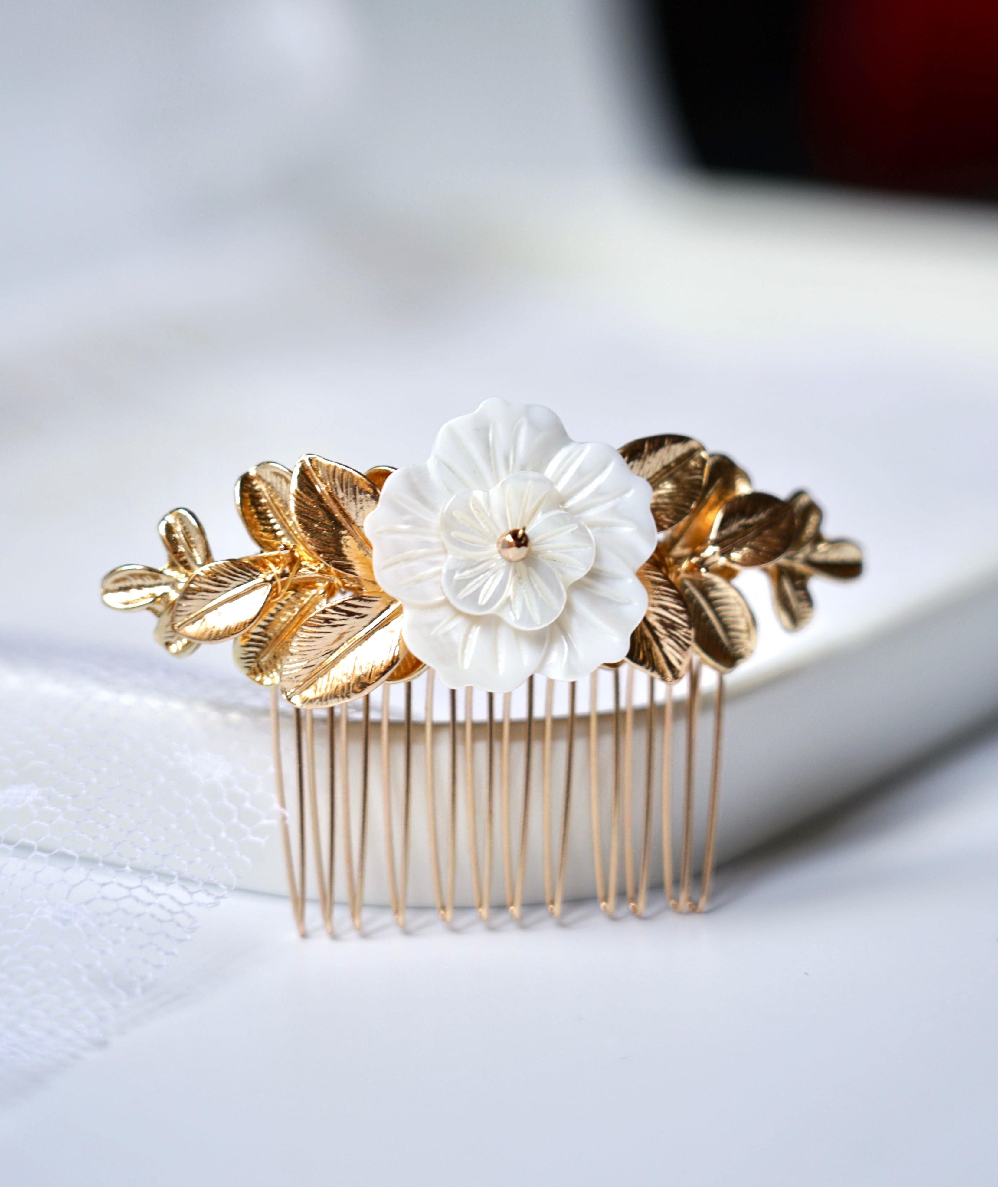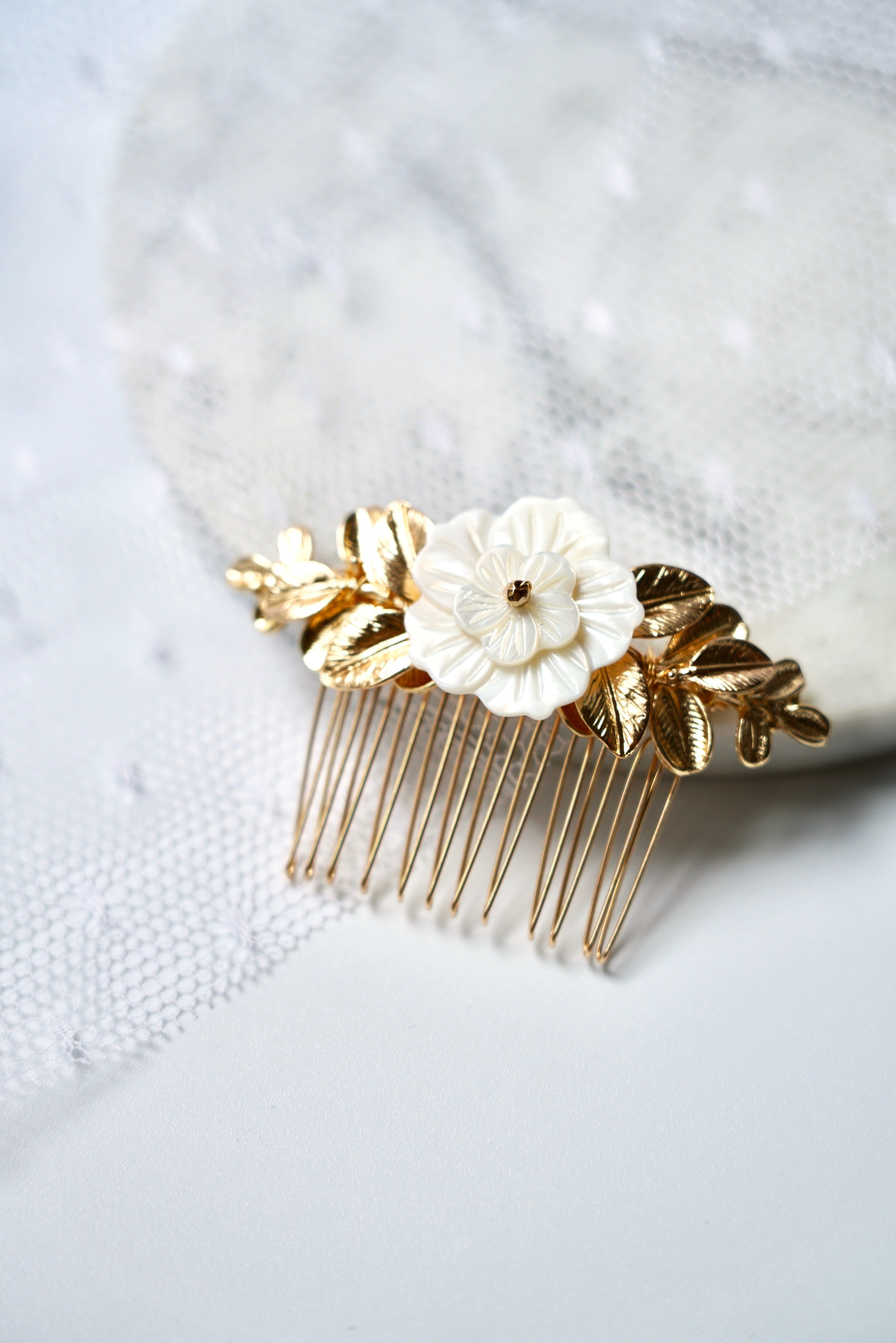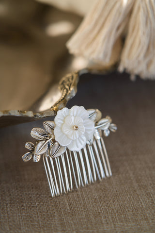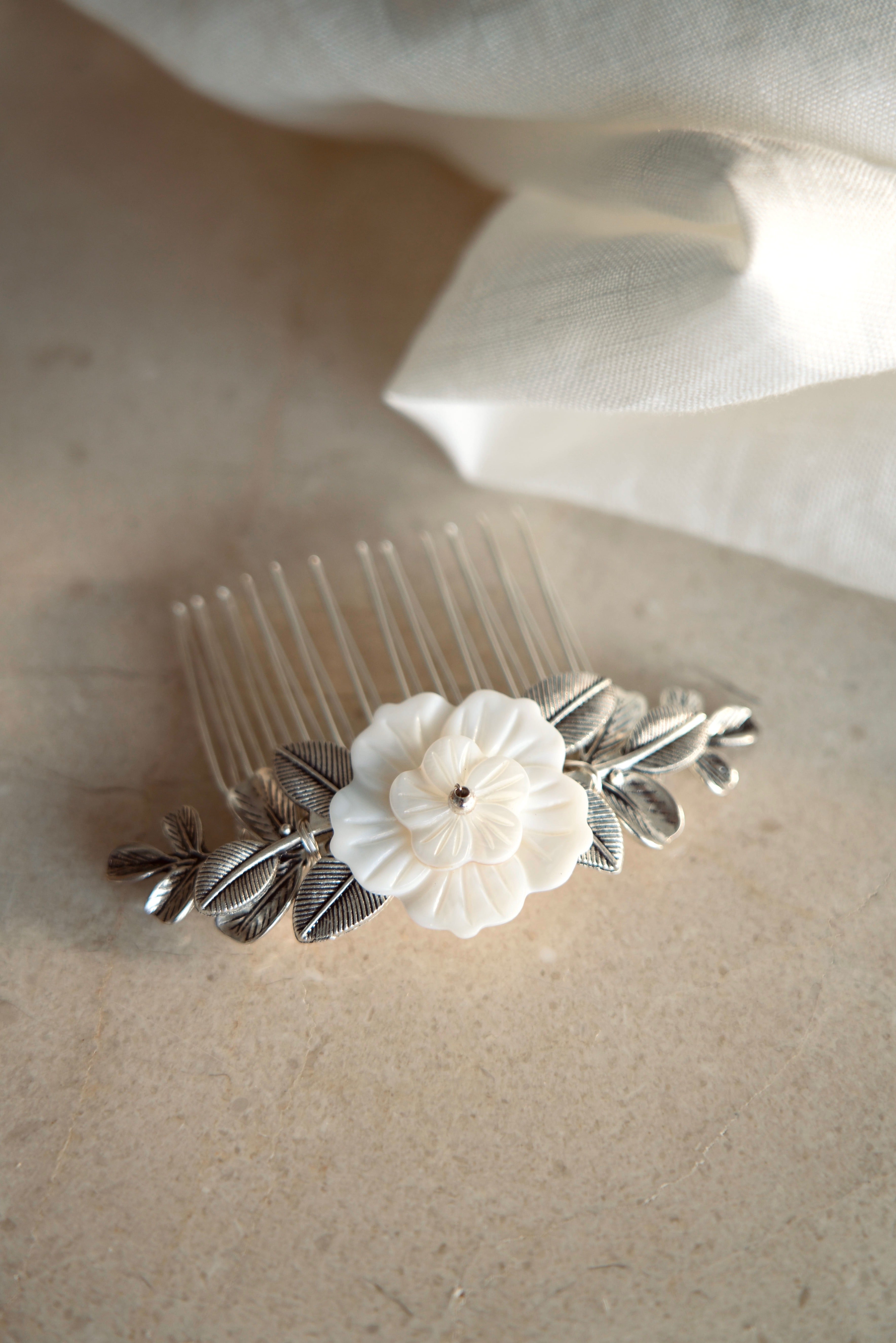 Esta criação é feita com ramos de folhas em estilo prata envelhecida. Duas flores médias esculpidas em madrepérola ou concha de pérola enfeitam o centro deste delicado pente.