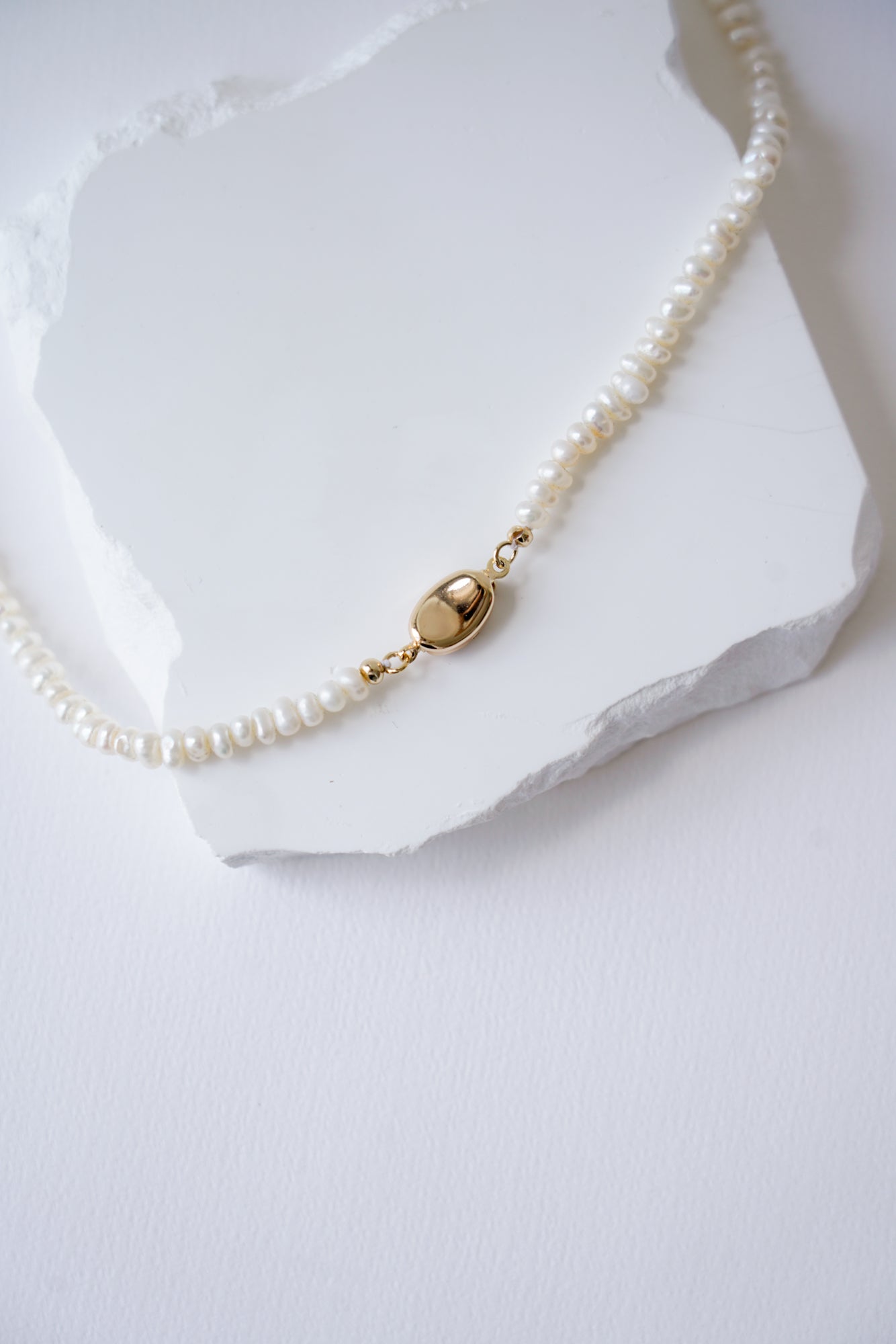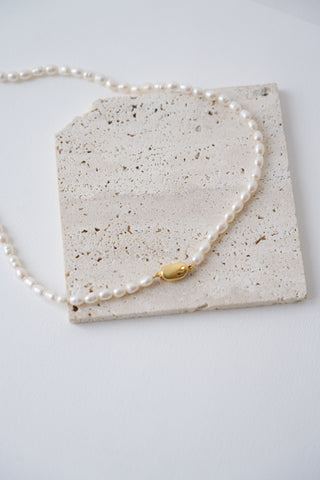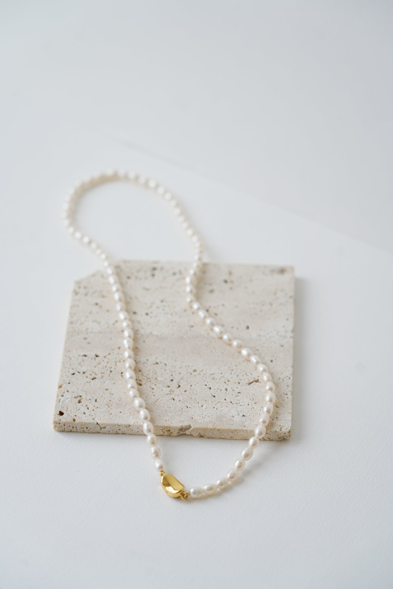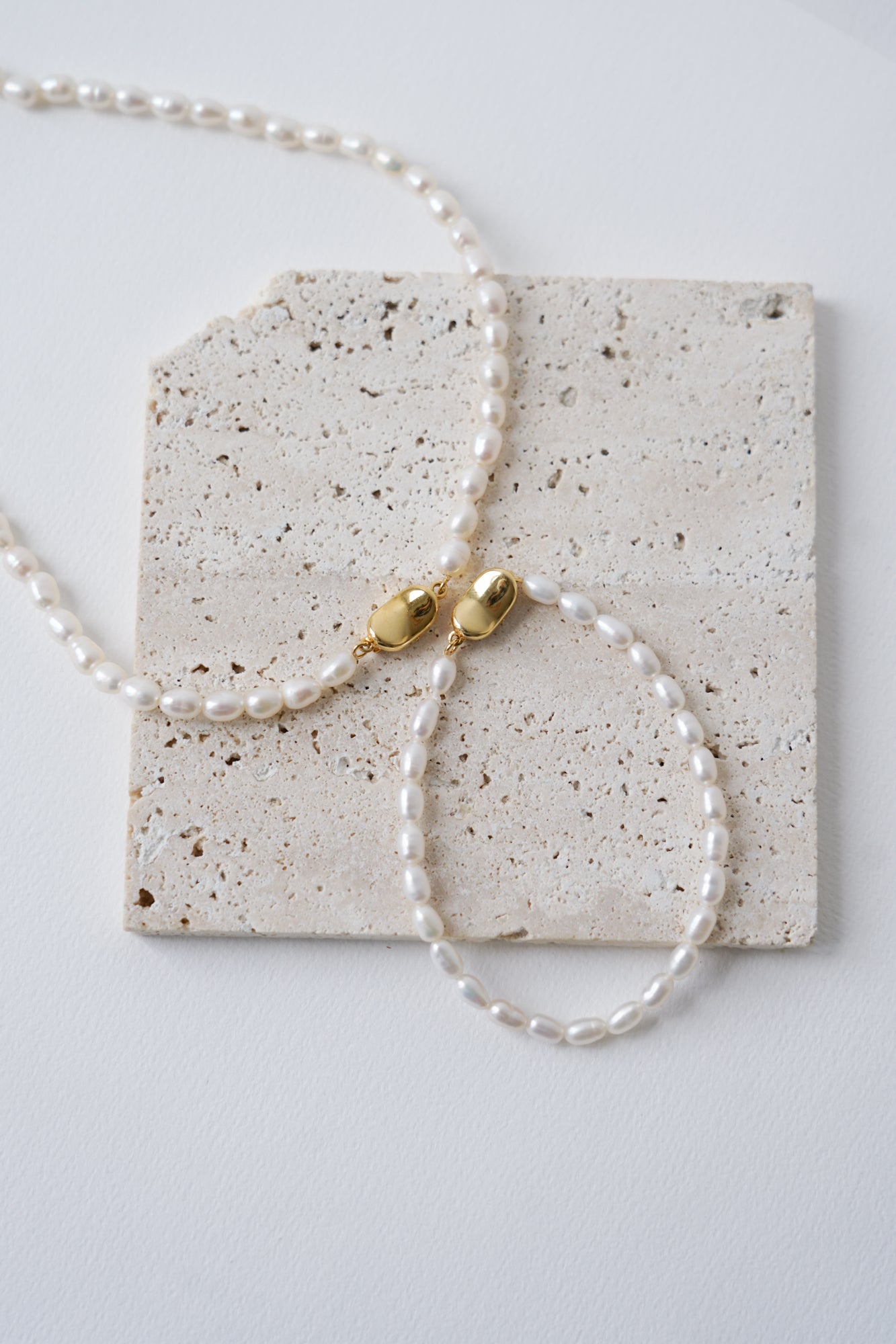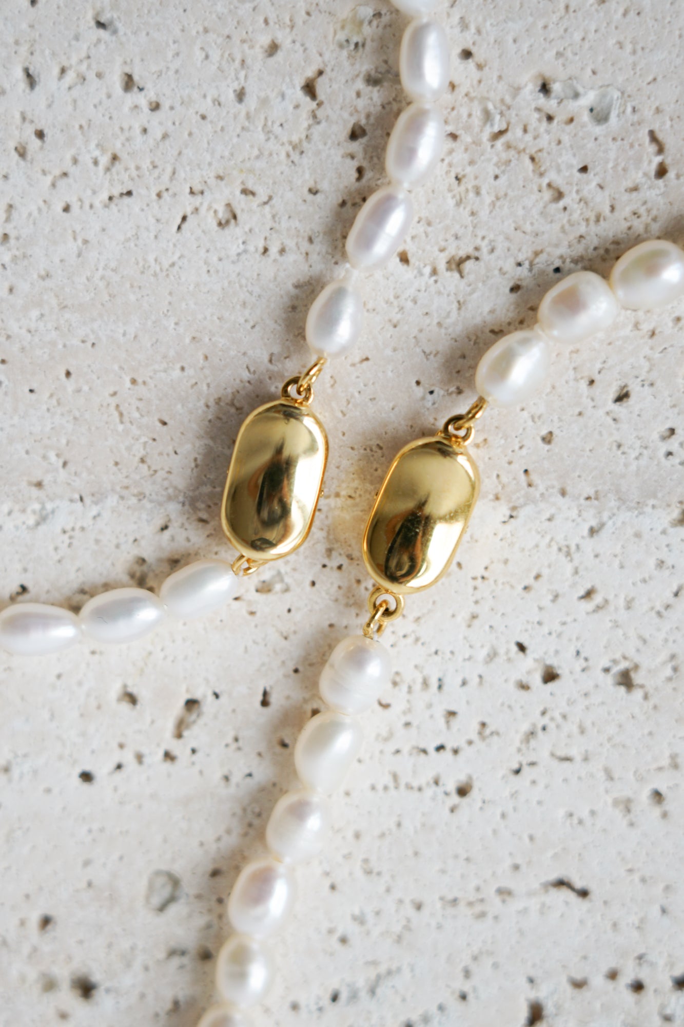 Este lindo colar é feito com pérolas naturais cultivadas. Estas elegantes pérolas alongadas, com reflexos iridescentes, são cuidadosamente enfiadas para criar uma joia elegante, refinada e atemporal. Um fecho em prata 925 banhado a ouro 18k adiciona um toque de elegância a este conjunto de contas.