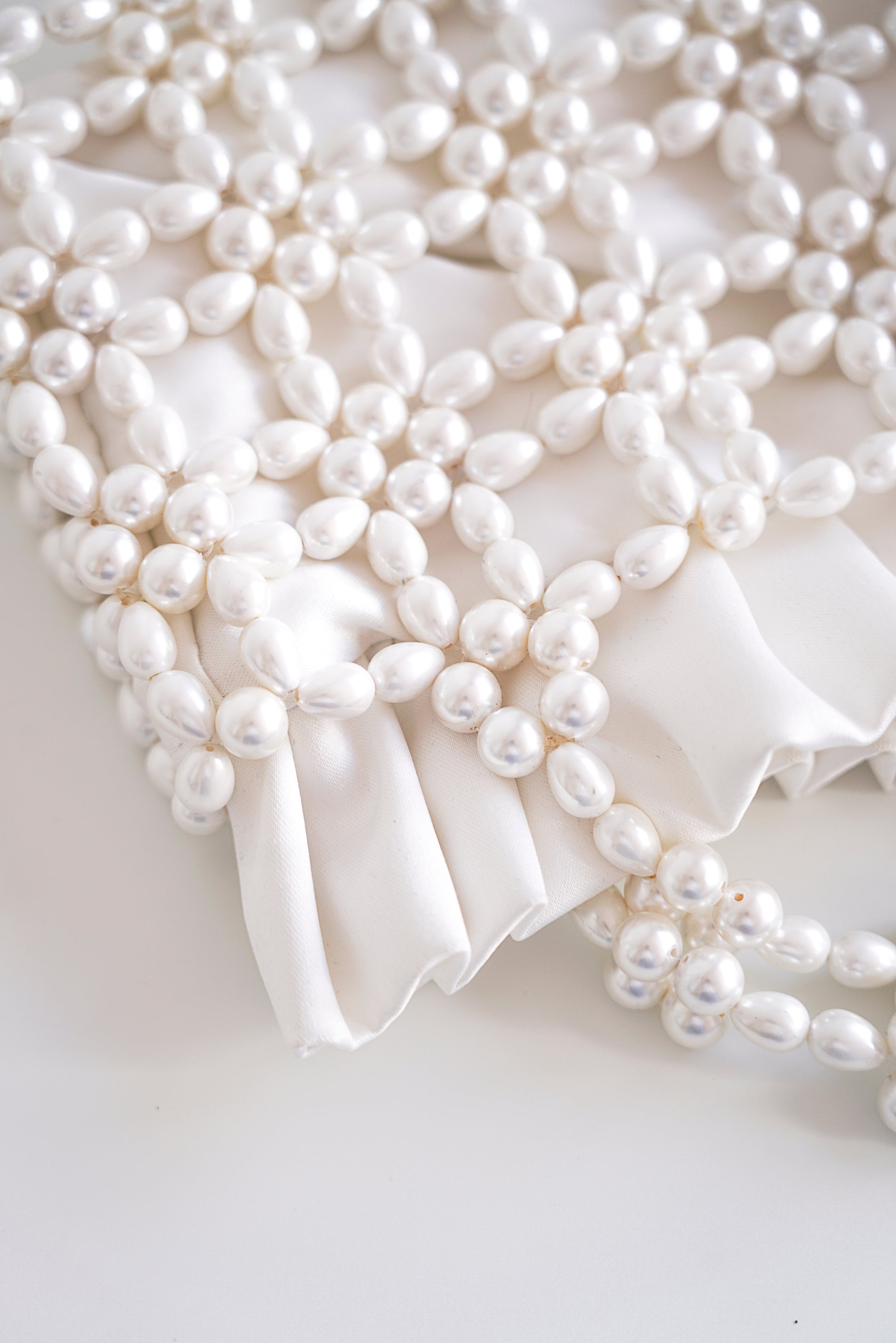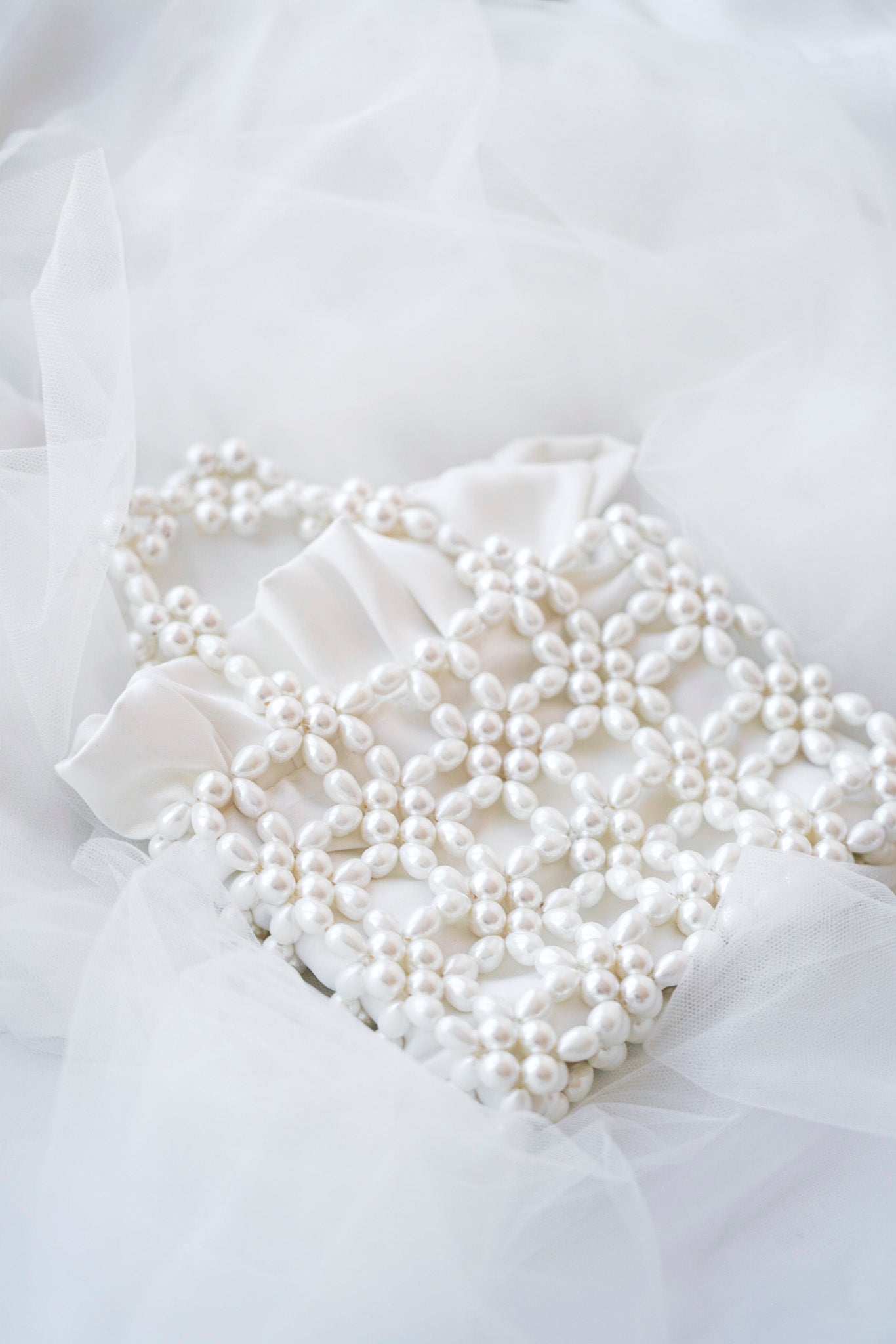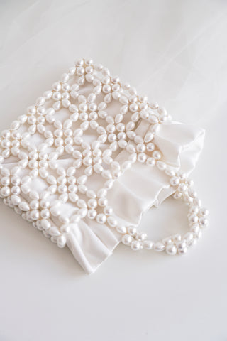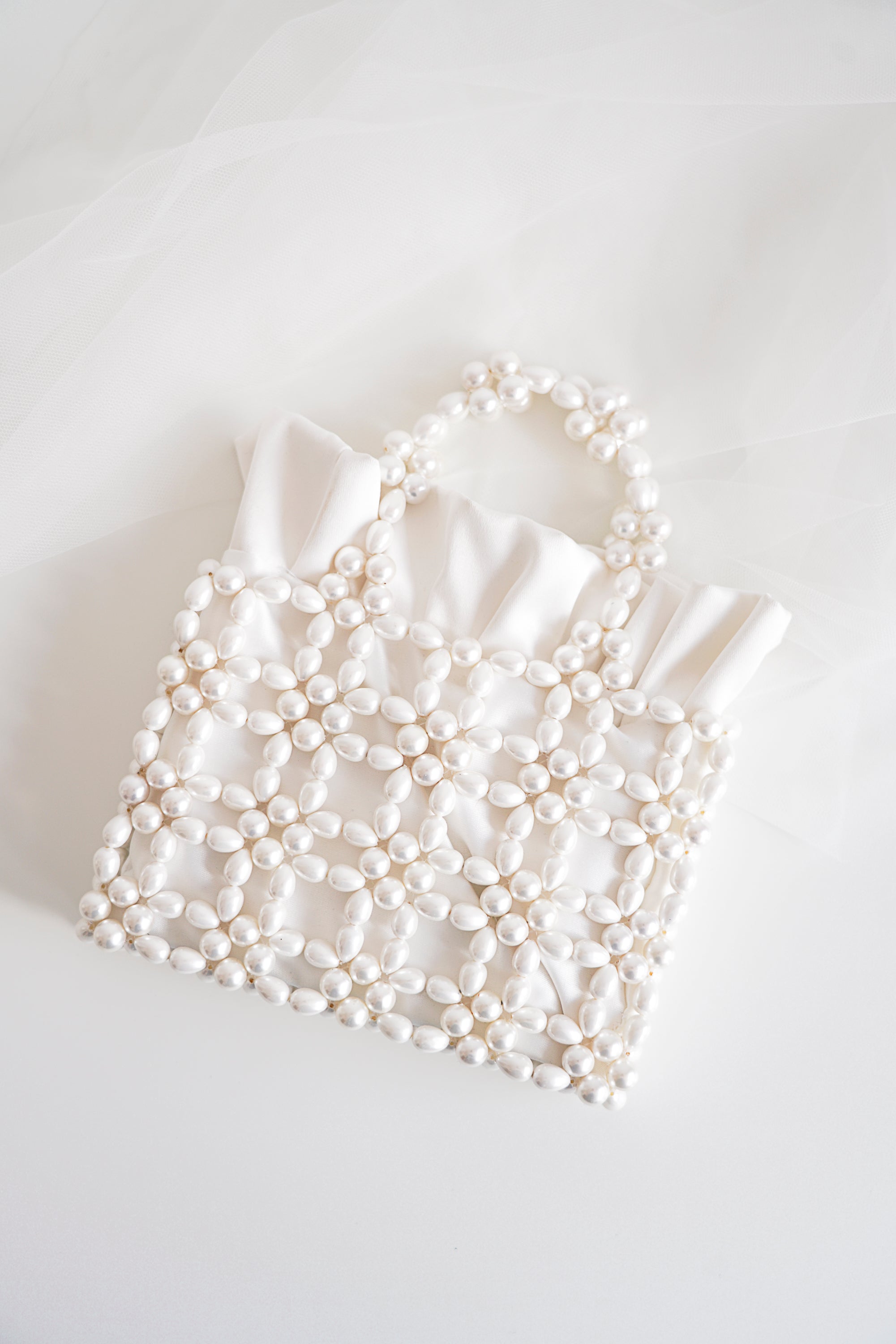 Esta linda bolsa de noiva com charme elegante e contemporâneo é feita a partir de um desenho de pérolas Shell. A forma quadrada da bolsa com as alças tecidas em pérolas e um tecido de cetim branco no interior chamara a atenção de todos os convidados graças a exclusividade e charme dela.