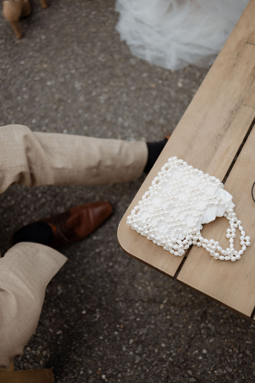 Sac de mariée rectangulaire blanc en satin et perles blanches