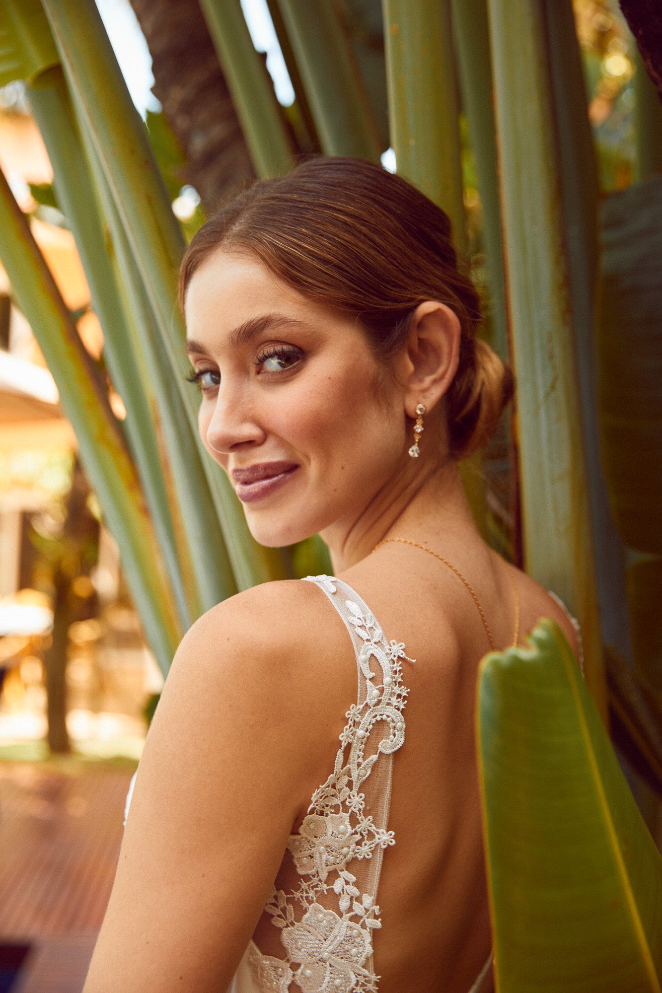 mariée dans le jardin du lieu de son mariage portant des boucles d'oreilles pendantes avec des zircons style romantique bohème